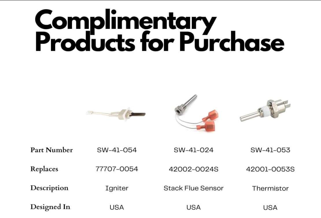 - Kit Includes: Thermistor, Stack Flue Sensor, High Limit Switch, AGS, Igniter , Thermal Regulator Kit, Control Board, Membrane Pad, Manifold Oring Set , Bypass Valve, and Air Flow Switch.